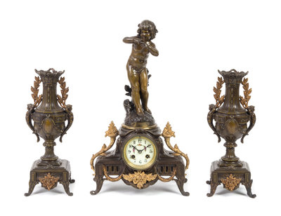 the mantel clock surmounted by a figure of a putto, the circular enameled dial with Arabic numeral hours.