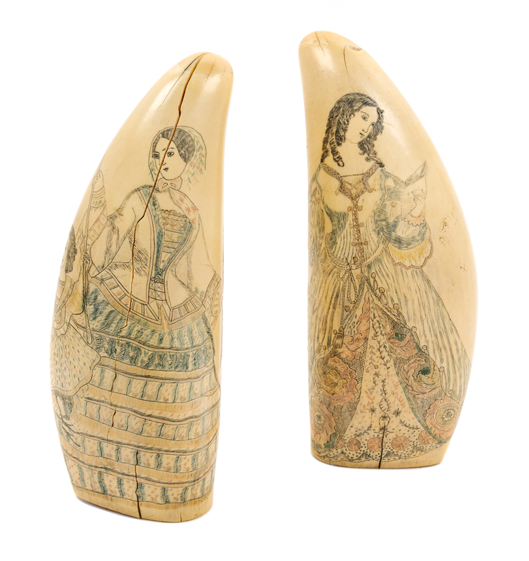 A Pair of Colored and Engraved Scrimshaw Whale Teeth