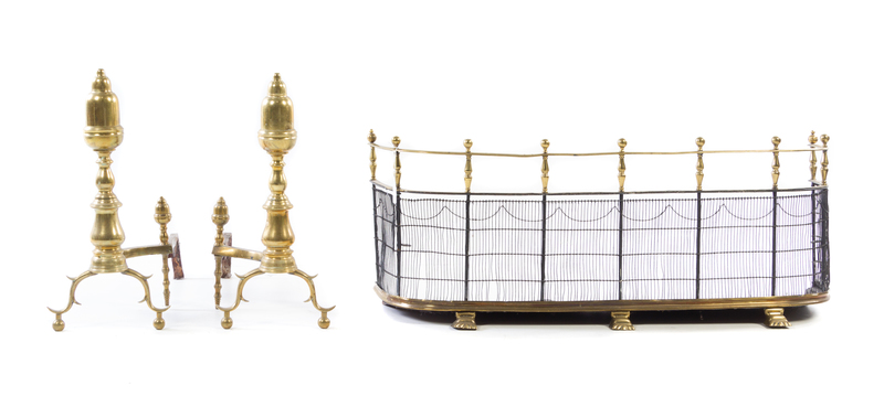 A Pair of American Brass Andirons and an Associated Fire Fender