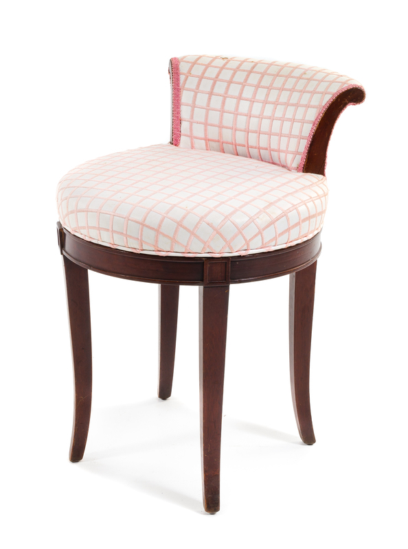 having an upholstered back and a circular stuffover seat, raised on splayed legs.