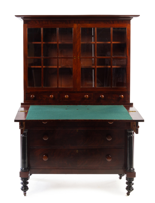 having a molded projecting cornice above two glazed doors opening to shelves and three aligned drawers, further over a hinged rectangular top opening to a felt-lined surface over three graduated long drawers, raised on turned feet ending in casters.