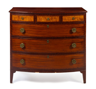 the bowfront top above the conforming case fitted with three aligned short drawers and three graduated long drawers, raised on short tapering legs.