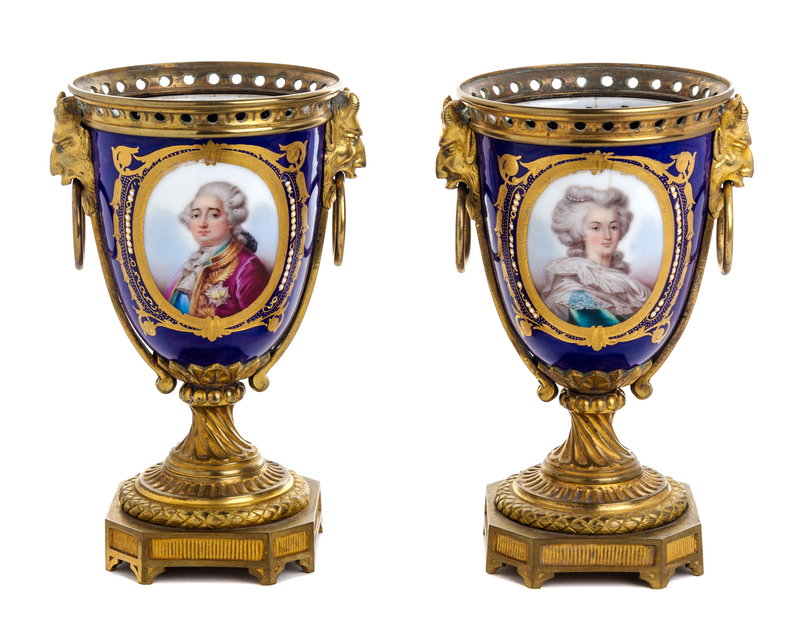 each mounted with satyr mask ring handles and centered with an oval cartouche depicting Louis XVI and Marie Antoinette against a cobalt ground with gilt highlights.