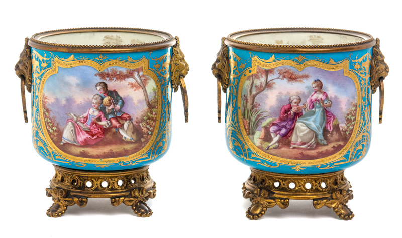 A Pair of Sevres Style Gilt Metal Mounted Porcelain Cache Pots