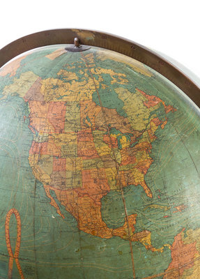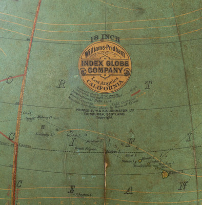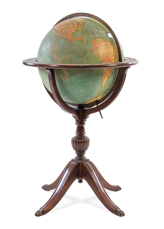 the globe marked Printed by W. & A.K. Johnston Ltd./ Edinburgh, Scotland, set on a knopped and reeded mahogany stand ending in a quadripartite base ending in paw cast casters.