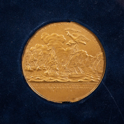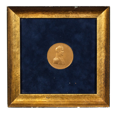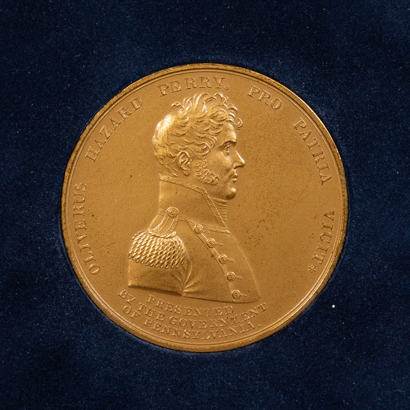commemorating Commodore Oliver Hazard Perry and the Battle of Lake Erie, 1813, the obverse depicting Oliver Hazard Perry in profile and inscribed Oliverus Hazard Perry Pro Patria Vicit/ Presented by the Government of Pennsylvania, the reverse depicting the British fleet on Lake Erie and inscribed We Have Met the Enemy; And They are Ours/ British Fleet on Lake Eerie/ Captured September 10, 1813, cut by Furst and signed Furst to the reverse.