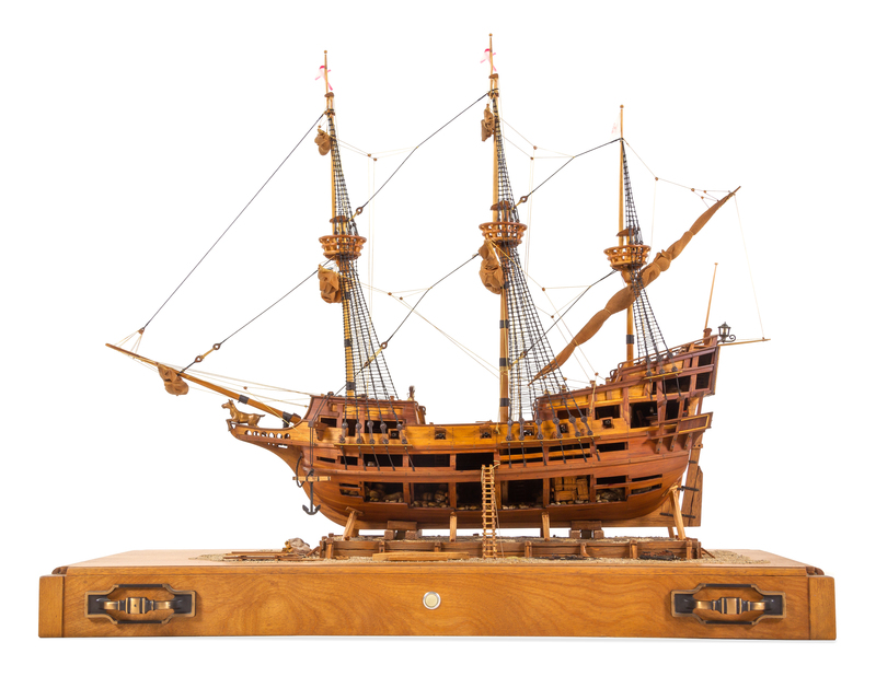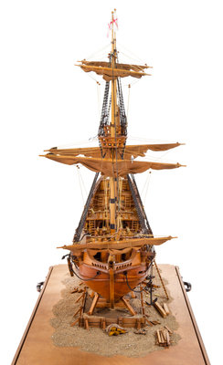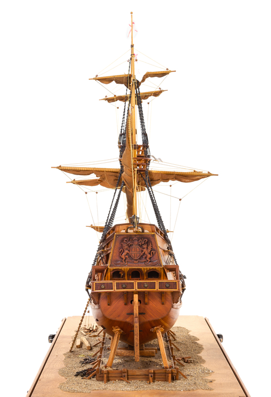 two of three masts with the Flag of England, the model set in a wood and glass display case.