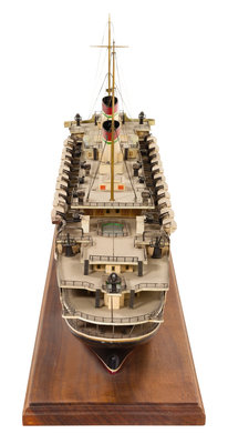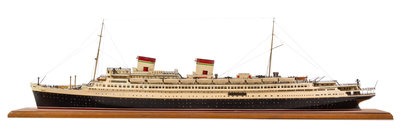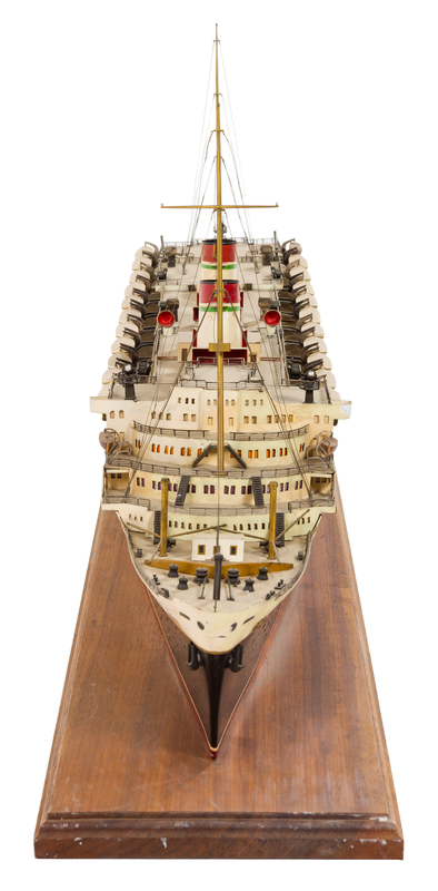 the black and white painted wood hull with gold and red highlights, issuing two brass masts with cables and two smoke stacks with green and red stripes, raised on a rectangular wood base, each side marked REX.
