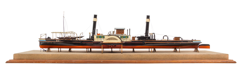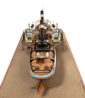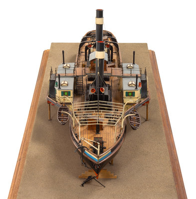 the black and red painted hull with two red paddle wheels, two smoke stacks and two life boats, raised on a rectangular wood base.