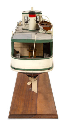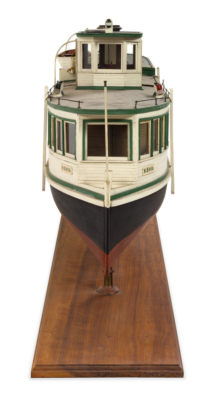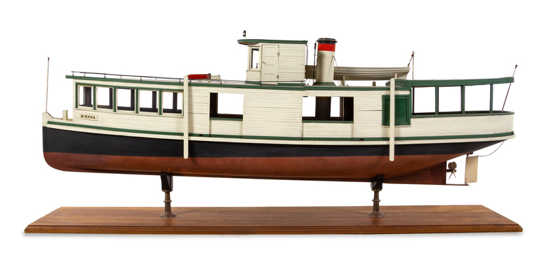 the black and red hull with one smoke stack and one life boat, raised on a rectangular wood base, marked NISHKA on each side.