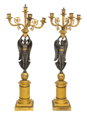 each in the form of a winged maiden supporting the candle arms and standing atop an orb, raised on a cylindrical standard ending in a stepped square base.