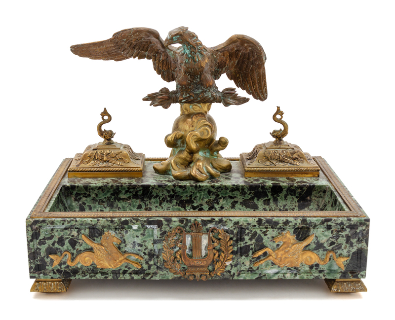 of rectangular form, surmounted by a spreadwing eagle flanked by two hinged inkwells cast to show stylized dolphins, raised on foliate feet.