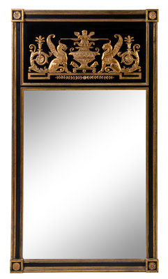 the upper panel decorated with opposing griffins flanking an urn, set with a rectangular mirror plate.