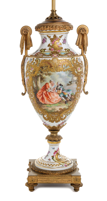 of handled baluster form, centered with a courting couple within a gilt foliate scroll cartouche signed Rabet, against a white ground with gilt highlights and floral sprays, mounted as a lamp.
