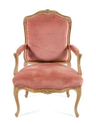 the domed floral carved crest rail above the padded back, arms and stuffover seat, raised on foliate carved cabriole legs ending in scroll feet.