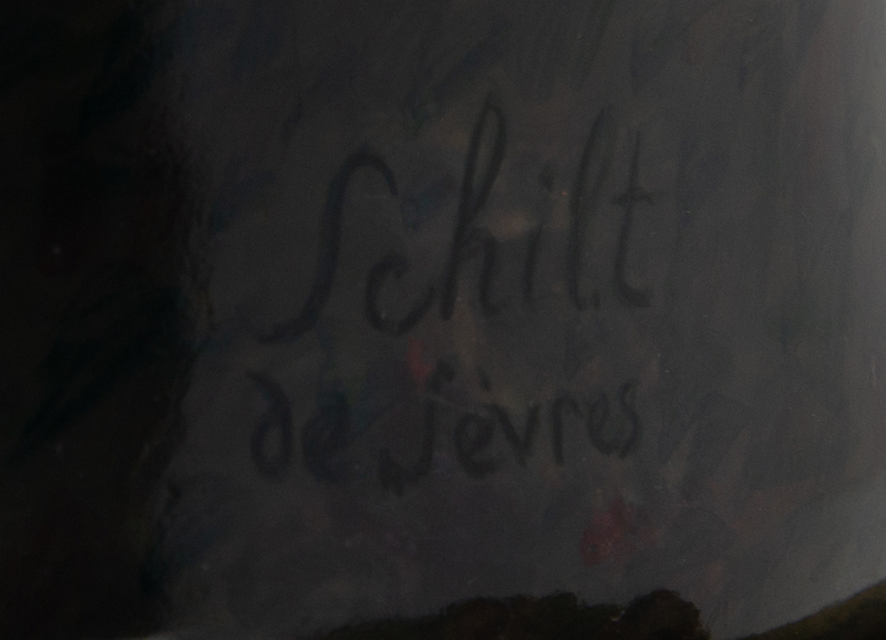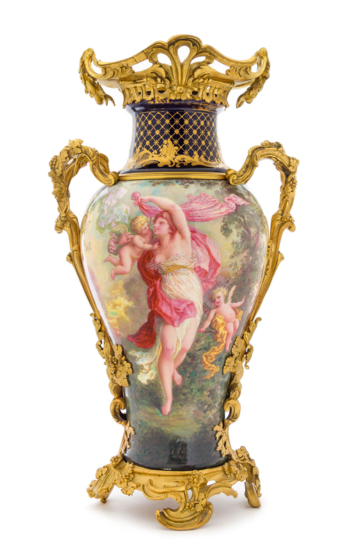 of baluster form, the pierced gilt bronze rim cast to show foliate scrolls and rocaille, the twin handles cast to show grapevines, the body painted to show a draped maiden with a cherub and Cupid, signed Schilt de Sevres.