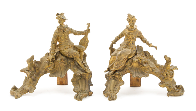 each in the form of a seated figure, raised on a base cast to show foliate scrolls and a shaped cartouche.