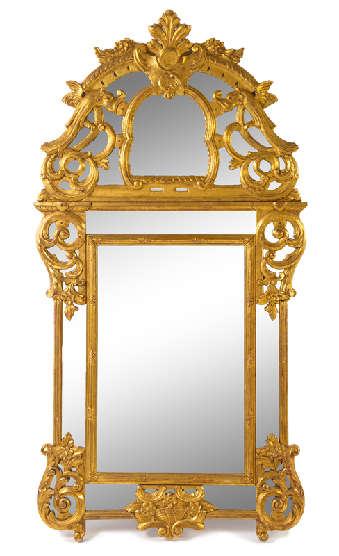 the crest rail centered with a palmette flanked by flowers and foliate scrolls, the segmented mirror plate within a similarly carved frame.