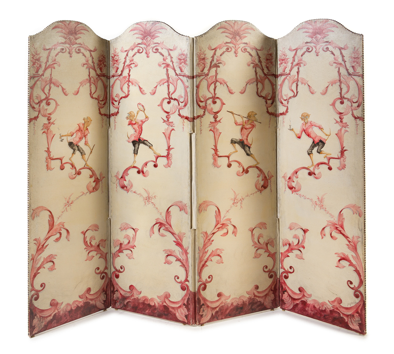each domed panel having a tooled edge and painted to depict monkeys engaged in various pursuits among foliate scrolls.