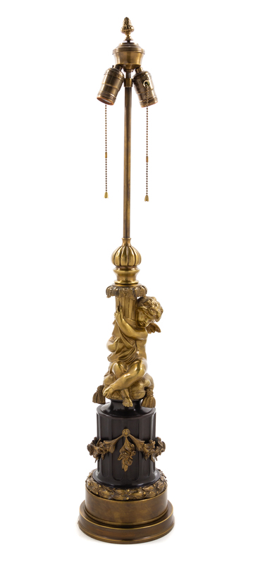 in the form of a cherub seated atop a pillow over a fluted stem and cylindrical plinth, wired for electricity.