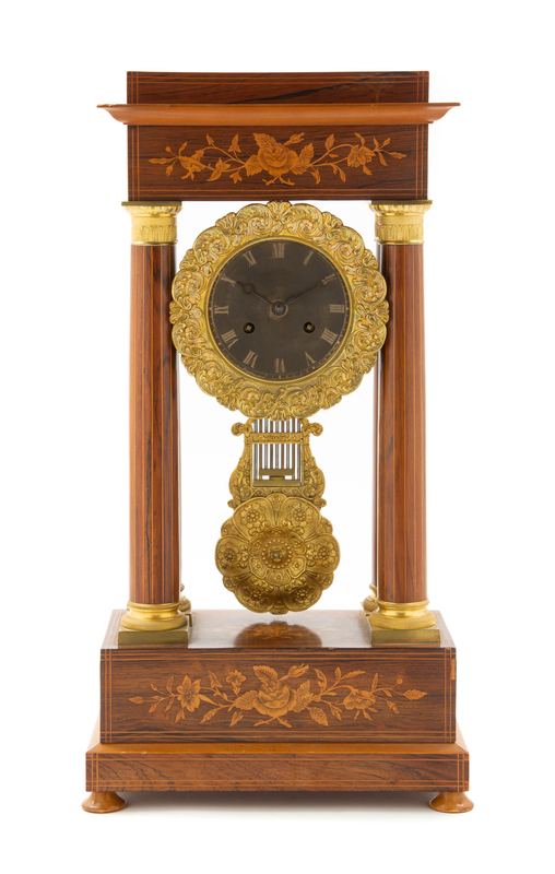 having a stepped cornice above the circular dial with Roman numeral hours, set on columnar supports, raised on a stepped rectangular base, inlaid throughout with flowering vines.
