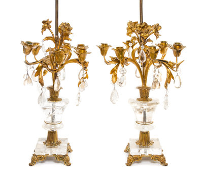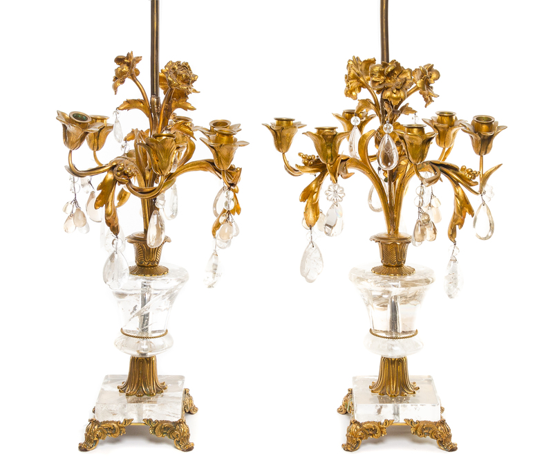 A Pair of French Gilt Bronze and Rock Crystal Six-Light Candelabra