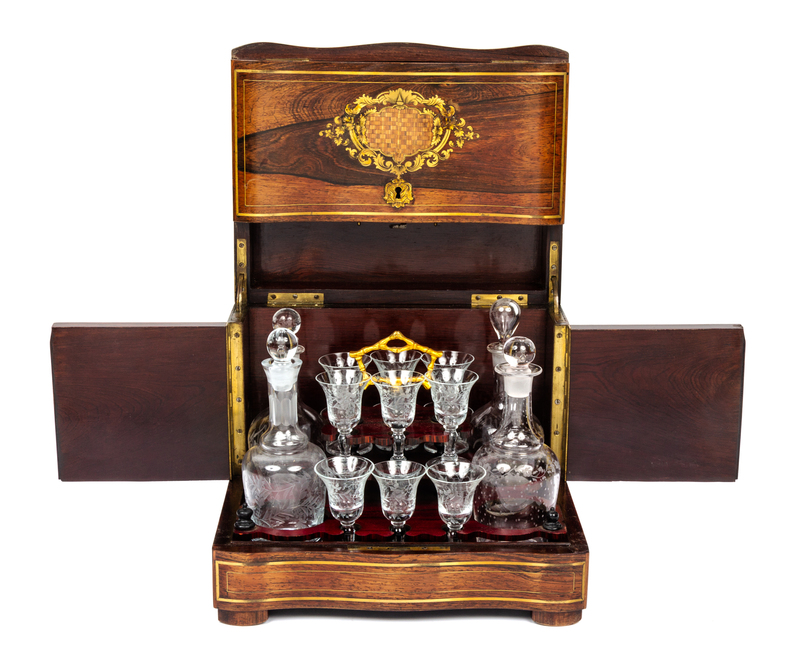 of rectangular form, the hinged top, front and sides opening to a caddy fitted with an assembled set of four decanters and twelve cordials.