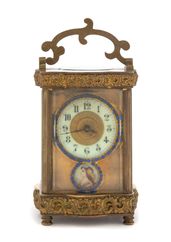 of typical handled form, the case cast throughout to show foliate scrolls, the face having a jeweled dial and portrait medallion, the movement stamped H&H/ Made in France.