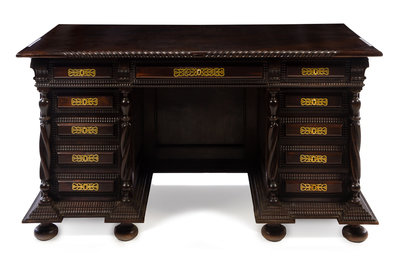 having a rectangular top with a gadroon edge above three aligned short drawers over two banks of four drawers flanked by knopped and twist carved cylindrical pilasters, raised on a molded base ending in bun feet.