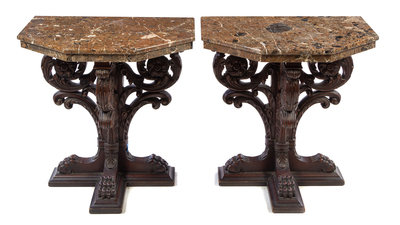 each having a shaped marble top above the frame carved to show foliate scrolls and rocaille, raised on a tripartite base ending in paw feet over a conforming molded plinth.