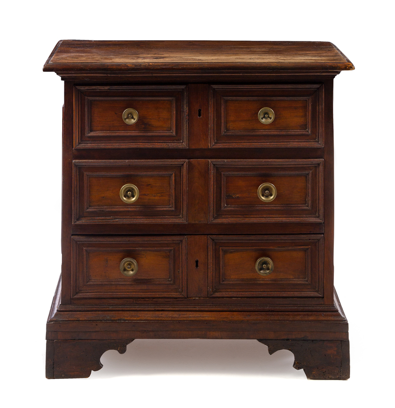 the rectangular top with a molded edge above three paneled and graduated long drawers, raised on ogee bracket feet.