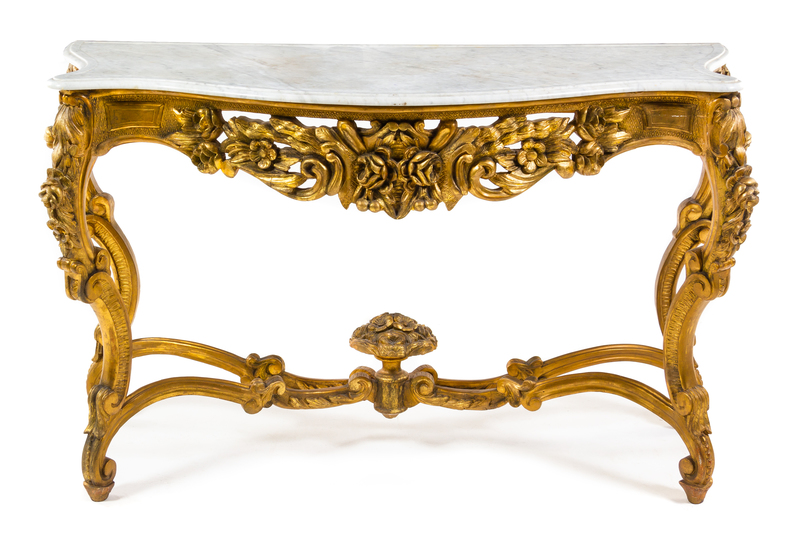 the marble top of serpentine outline above the frieze pierce carved to show flowers and foliate scrolls, raised on floral carved cabriole legs joined by a conforming X-form stretcher and ending in scroll feet.
