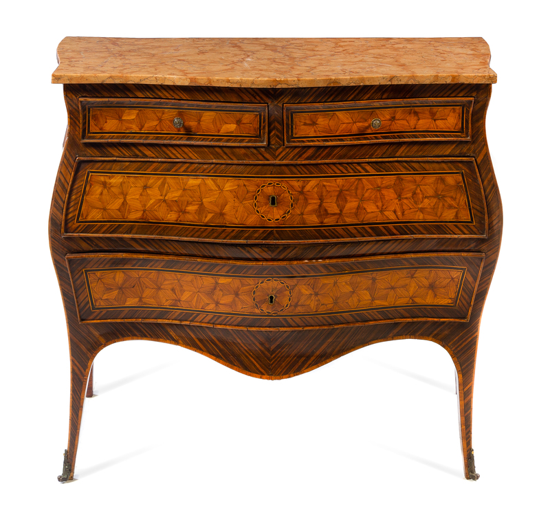having a serpentine marble top above the bombe form case fitted with two short drawers and two long drawers, raised on cabriole legs ending in sabots.