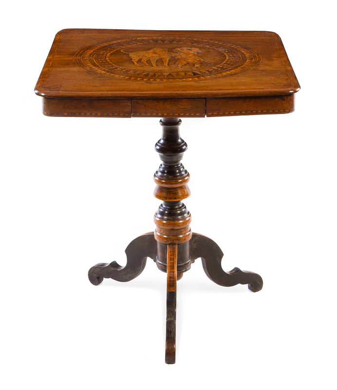 the rectangular top with rounded corners inlaid to show a child and a dog, set on a turned baluster standard ending in a tripod base.