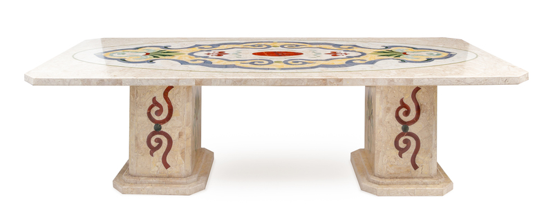 the rectangular top with canted corners, raised on twin pedestals, the top decorated with foliate scrolls within an oval cartouche.