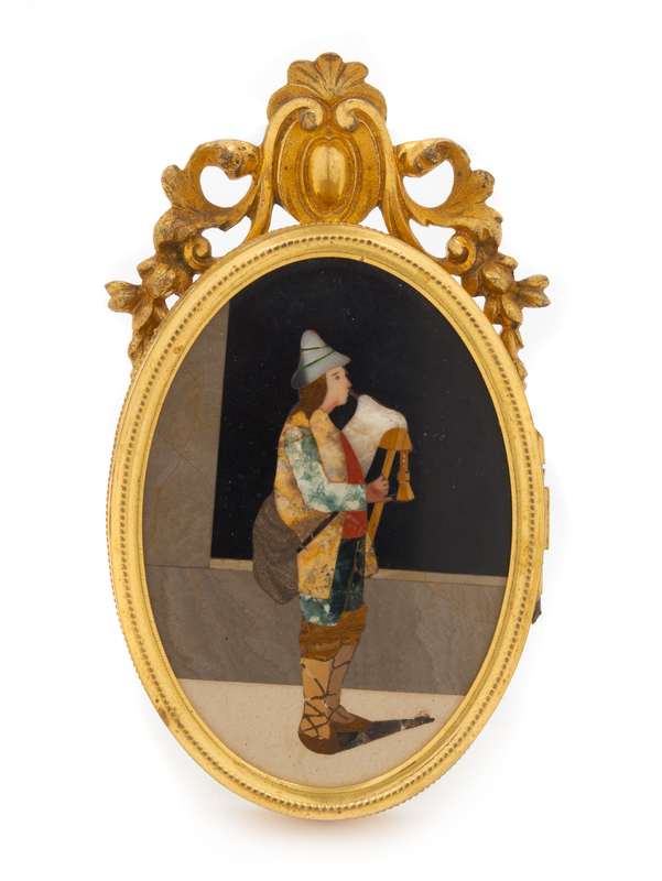 of oval form, worked to show a man playing a bagpipe, the hinged top opening to a glass inset interior.