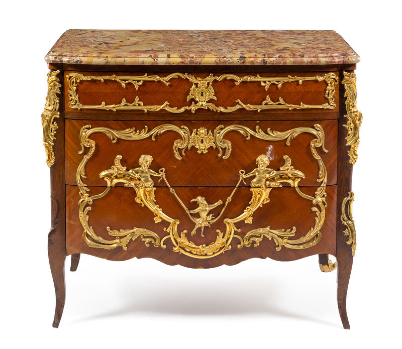 having a breche d'alep marble top above the conforming case fitted with three graduated drawers and mounted with a monkey walking a tightrope suspended by two putti among foliate scrolls and rocaille, raised on cabriole legs.