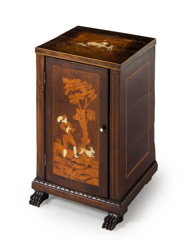 the square top and cabinet door both inlaid to show a hunting scene, raised on paw feet.