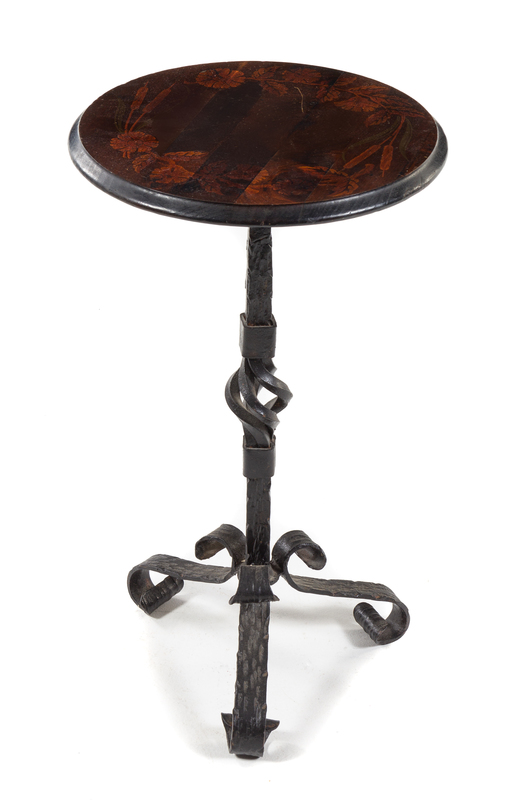 the circular top inlaid to show flowering vines and cattails, set on a wrought iron standard ending in a tripod base formed of S-scrolls.