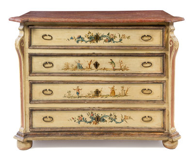 having a rectangular faux marble top with canted fore-corners above the case fitted with four long drawers, raised on flattened bun feet.