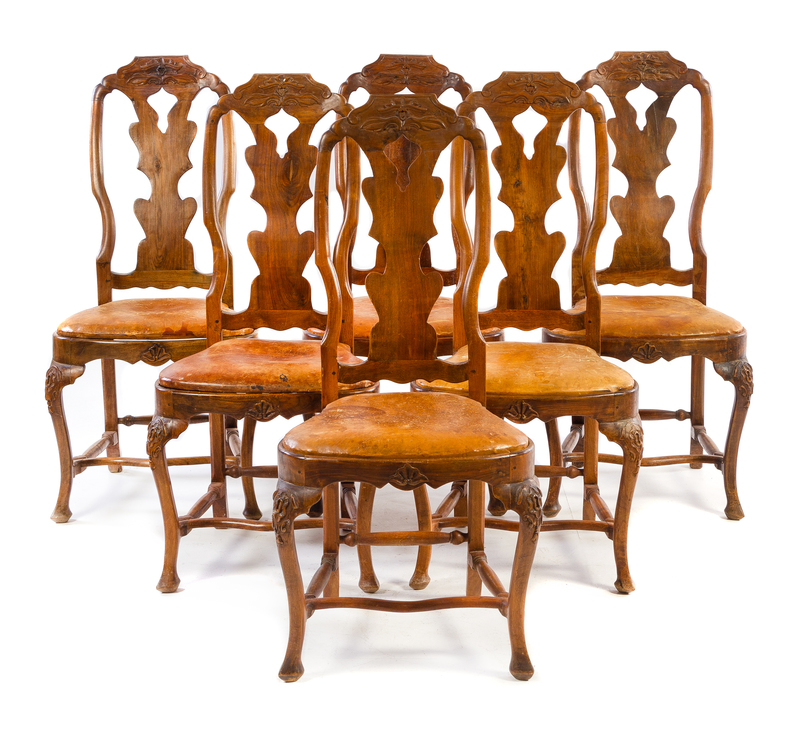 each having a shaped foliate carved crest rail above the shaped splat and drop-in leather upholstered compass seat, raised on carved cabriole legs joined by stretchers.