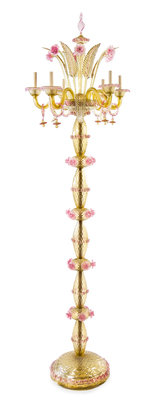 the baluster form standard issuing the six S-scroll candle arms, further set with floral and foliate decoration.