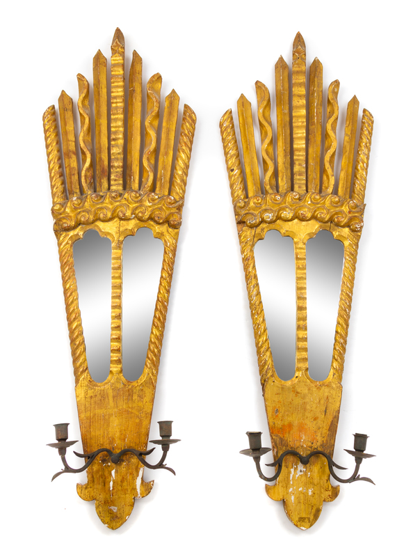 each of tapering form with twist-carved and Greek wave decoration, issuing two candle arms.