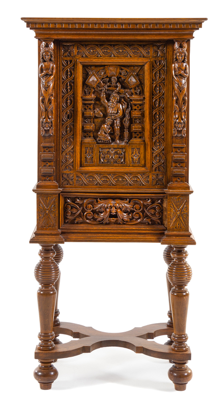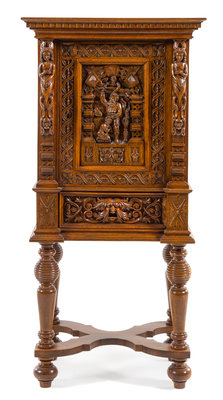 having a molded projecting cornice and a dentiled frieze above the case with a cabinet door carved to show Abraham preparing to sacrifice Isaac in relief and flanked by figural pilasters, further fitted with a drawer carved to show a grotesque mask, raised on knopped and ring turned cylindrical tapering legs ending in toupie feet and joined by an X-form stretcher.