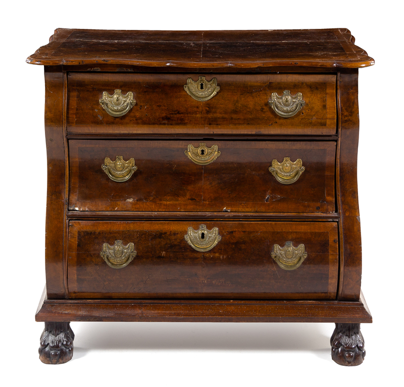 the shaped rectangular top above the conforming case fitted with three graduated drawers, raised on hairy paw feet.