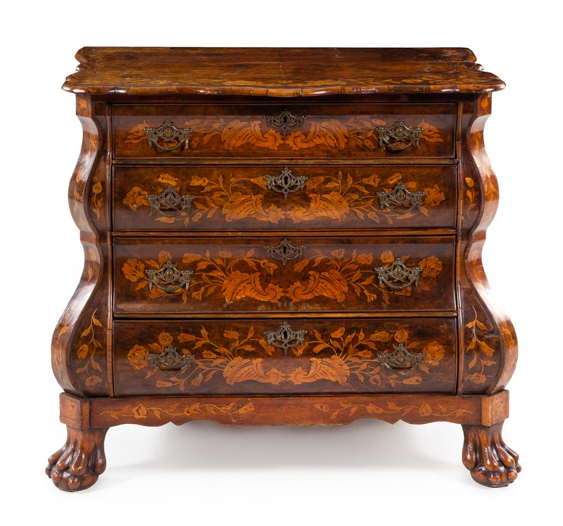 the rectangular top of serpentine outline above the conforming bombe form case fitted with four graduated drawers, raised on claw and ball fore-feet, inlaid throughout to show cornucopias and flowering vines.