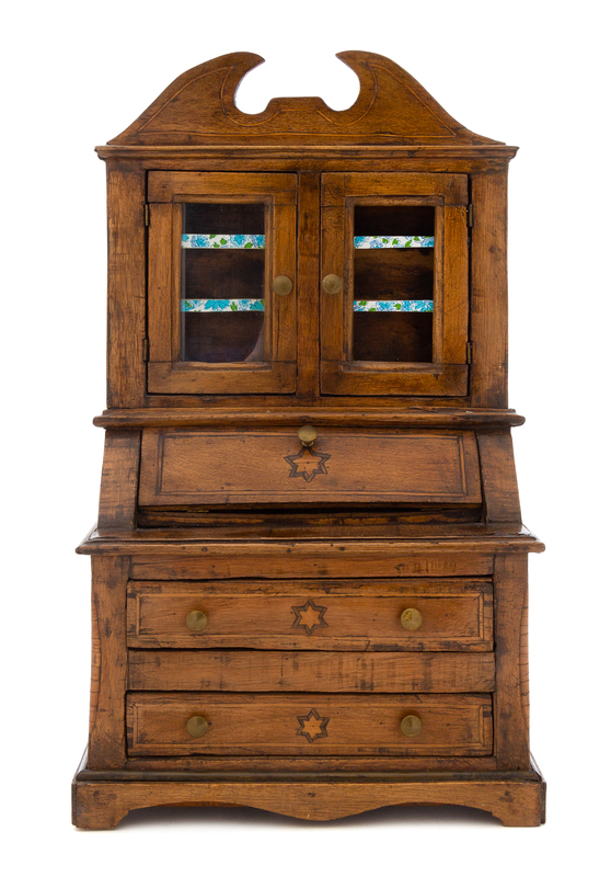 the swan neck pediment above two glazed doors opening to two shelves, a slant-front surface and two drawers, raised on a bracket base, inlaid with three six-point stars.