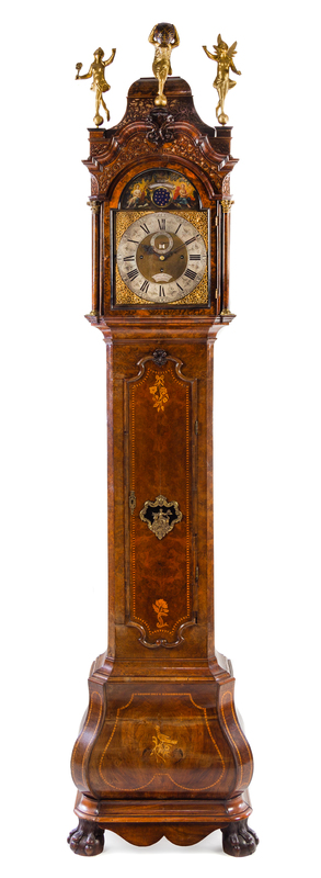 the hood surmounted by figures of Atlas and heralding angels, the painted face with brass spandrels surrounding the dial having Roman numeral hours and Arabic numeral minutes.