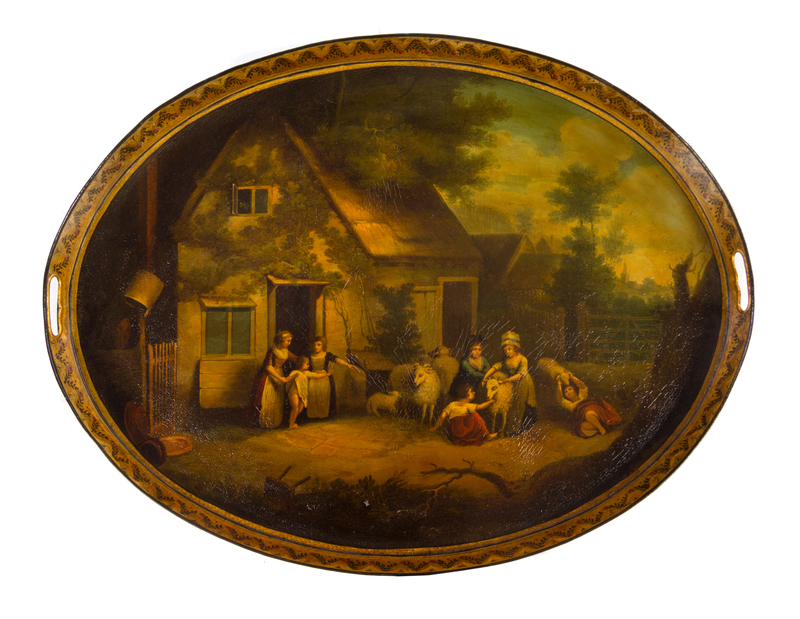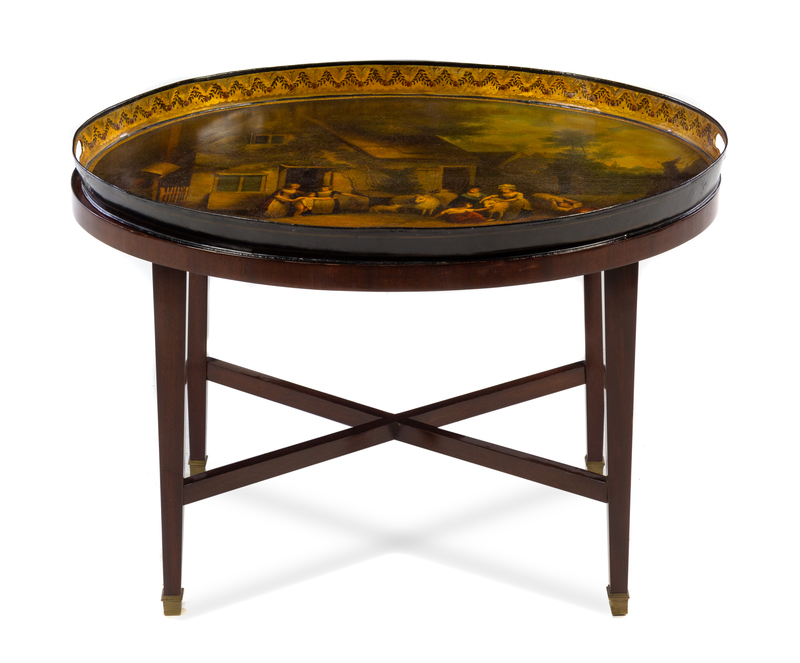 of handled oval form, depicting a barnyard scene, raised on a later mahogany stand joined by an X-form stretcher.
