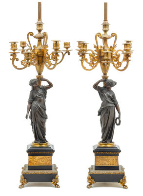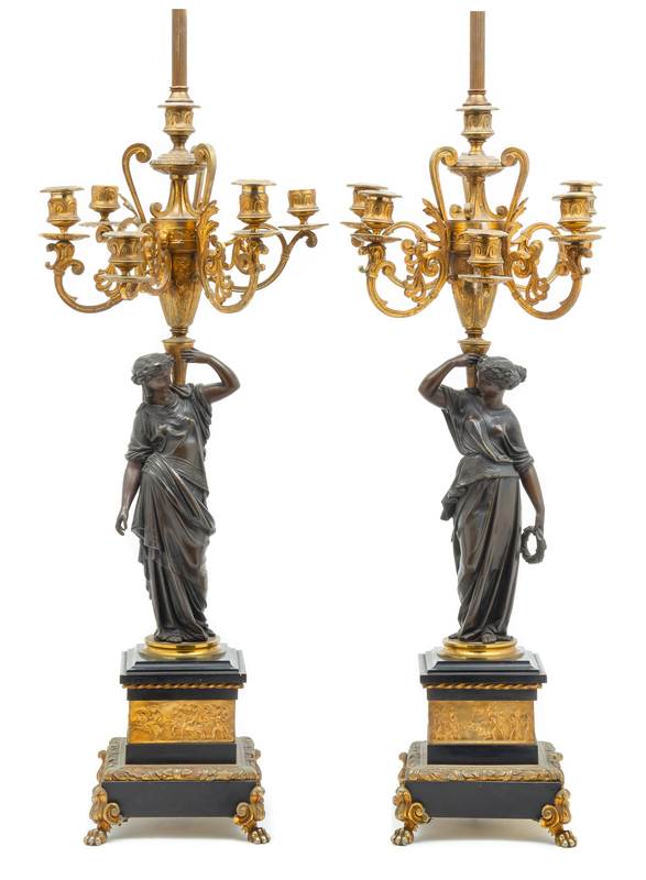 each in the form of a classically draped maiden supporting an urn issuing the scrolling candle arms, raised on a stepped rectangular base cast to show classical battle scenes and raised on paw feet.